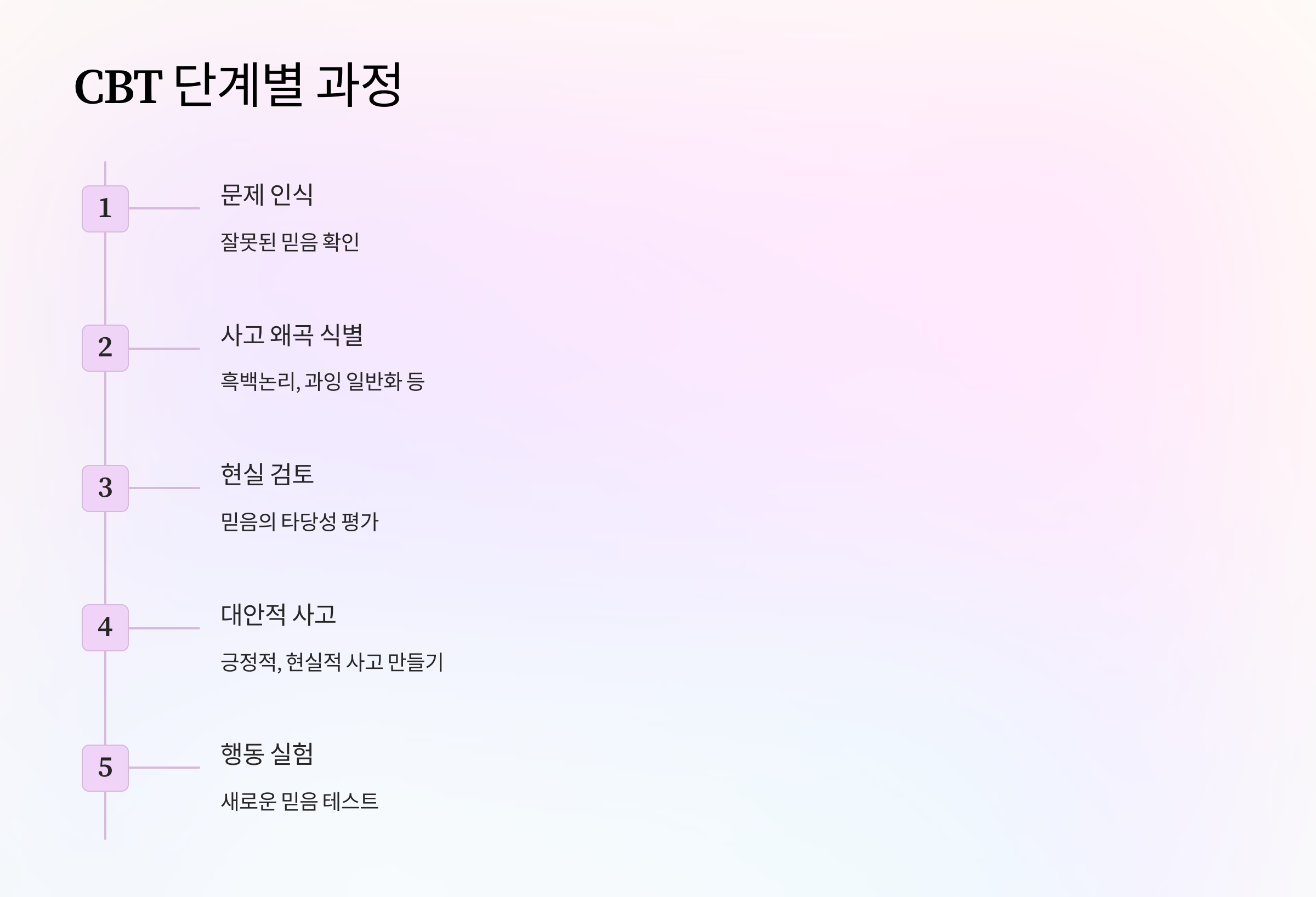 이러한 믿음은 현실을 왜곡하고, 불안, 우울, 자신감 결여 등의 문제를 초래할 수 있습니다. CBT는 이러한 잘못된 믿음을 인식하고 수정하는 과정을 체계적으로 제공합니다.